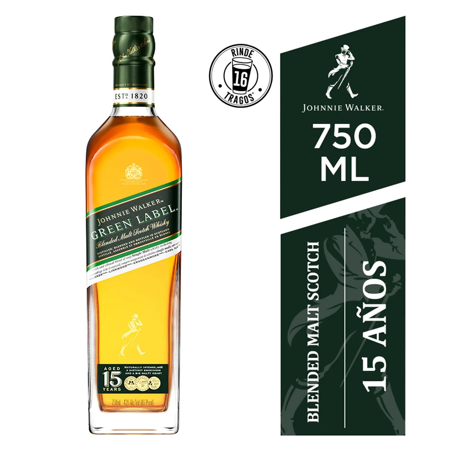 El whisky Johnnie Walker Green Label de 750 cc es una mezcla meticulosamente elaborada de whiskys de malta puros añejados durante al menos 15 años. Este whisky ofrece un perfil complejo con ricas notas de fruta fresca, turba ahumada y sutiles especias, reflejo de una elaboración experta. Ideal para los entendidos que buscan profundidad y equilibrio, ofrece una experiencia suave y compleja que realza la tradición de la elaboración tradicional del whisky escocés. Perfecto para saborear solo o para realzar cócteles sofisticados.